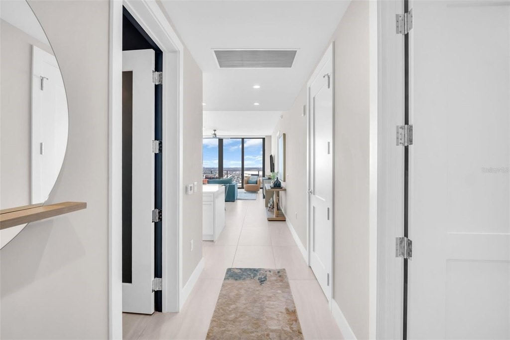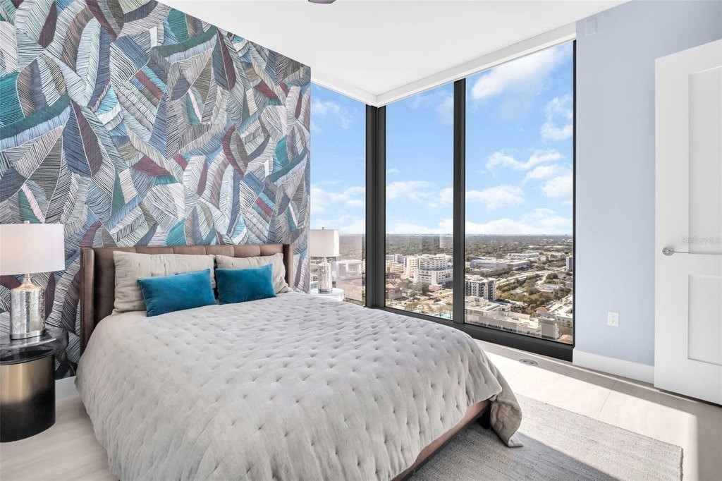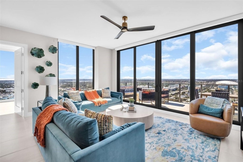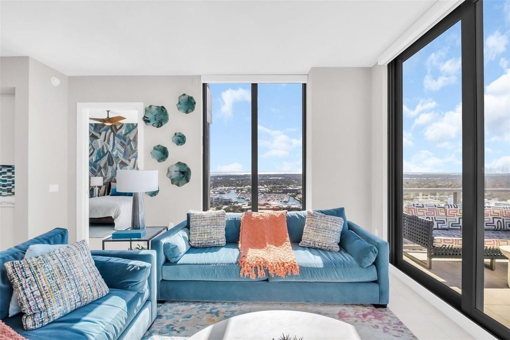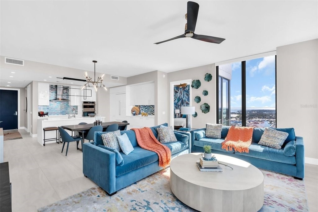 Experience elevated downtown living in this professionally designed 2-bedroom plus den, 2.5-bath residence at Saltaire, offering 1,663 square feet of refined interior space and breathtaking, sky-high views. From sunrise over the water and marina to sweeping city skyline vistas and the dynamic backdrop of Albert Whitted Airport, this home delivers a front-row seat to St. Petersburg's most iconic scenery. Inside, sophisticated design and thoughtful upgrades create an effortlessly luxurious atmosphere. Porcelain tile flooring throughout, designer lighting, and high-end wallpapered accent walls elevate the space, while a striking coastal-style backsplash and wine chiller add both beauty and function to the gourmet kitchen. Electric blinds enhance comfort and convenience, allowing you to tailor light and privacy with ease. Furniture is negotiable, offering flexibility for a truly turnkey experience. This residence also includes two convenient parking spaces and a private storage unit, a rare and valuable perk in downtown living. Beyond your front door, Saltaire offers a lifestyle defined by world-class amenities: a resort-style pool and spa, multiple elegant club rooms for entertaining, a full-service fitness center, and a dedicated dog park for four-legged residents. The seventh-floor open-air deck provides panoramic views of Tampa Bay and the downtown waterfront-an unforgettable setting for sunsets and gatherings. Ideally located in the heart of downtown St. Petersburg, enjoy effortless access to waterfront parks, marinas, acclaimed dining, boutique shopping, and cultural destinations just steps away.