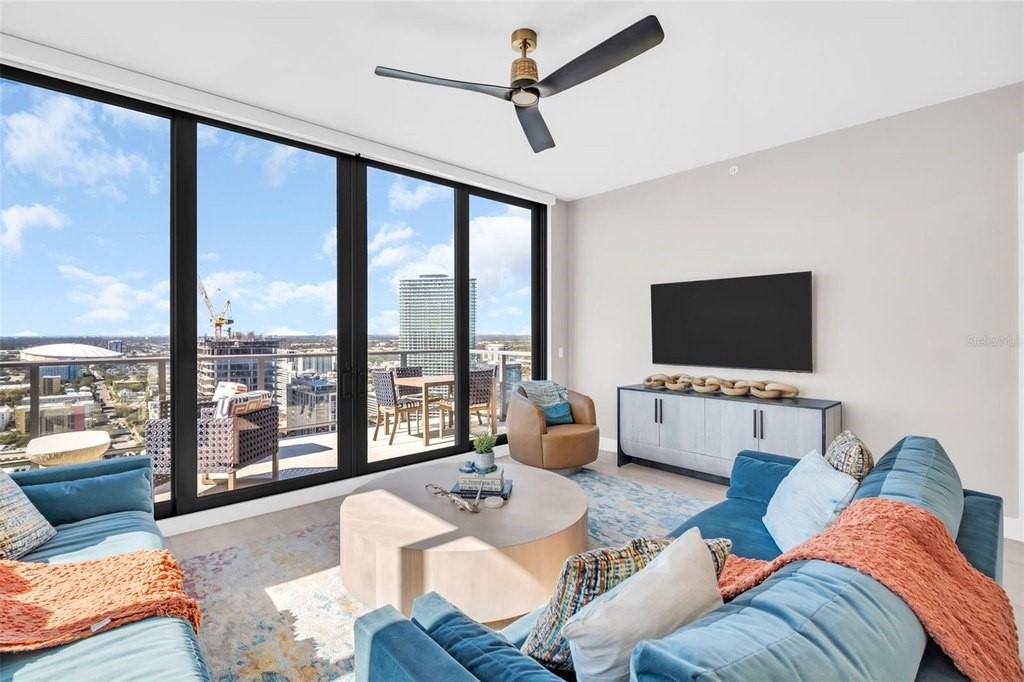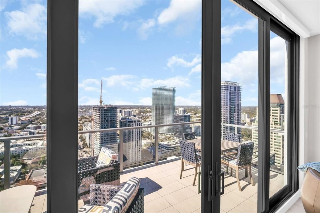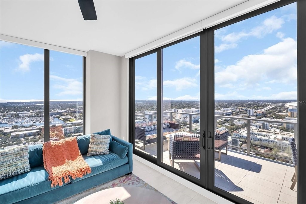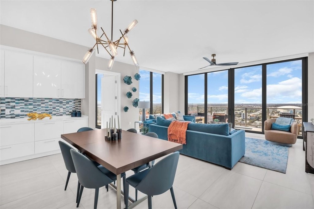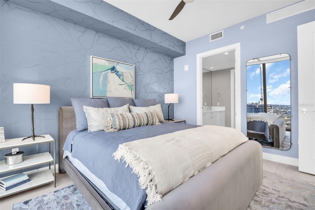 Experience elevated downtown living in this professionally designed 2-bedroom plus den, 2.5-bath residence at Saltaire, offering 1,663 square feet of refined interior space and breathtaking, sky-high views. From sunrise over the water and marina to sweeping city skyline vistas and the dynamic backdrop of Albert Whitted Airport, this home delivers a front-row seat to St. Petersburg's most iconic scenery. Inside, sophisticated design and thoughtful upgrades create an effortlessly luxurious atmosphere. Porcelain tile flooring throughout, designer lighting, and high-end wallpapered accent walls elevate the space, while a striking coastal-style backsplash and wine chiller add both beauty and function to the gourmet kitchen. Electric blinds enhance comfort and convenience, allowing you to tailor light and privacy with ease. Furniture is negotiable, offering flexibility for a truly turnkey experience. This residence also includes two convenient parking spaces and a private storage unit, a rare and valuable perk in downtown living. Beyond your front door, Saltaire offers a lifestyle defined by world-class amenities: a resort-style pool and spa, multiple elegant club rooms for entertaining, a full-service fitness center, and a dedicated dog park for four-legged residents. The seventh-floor open-air deck provides panoramic views of Tampa Bay and the downtown waterfront-an unforgettable setting for sunsets and gatherings. Ideally located in the heart of downtown St. Petersburg, enjoy effortless access to waterfront parks, marinas, acclaimed dining, boutique shopping, and cultural destinations just steps away.